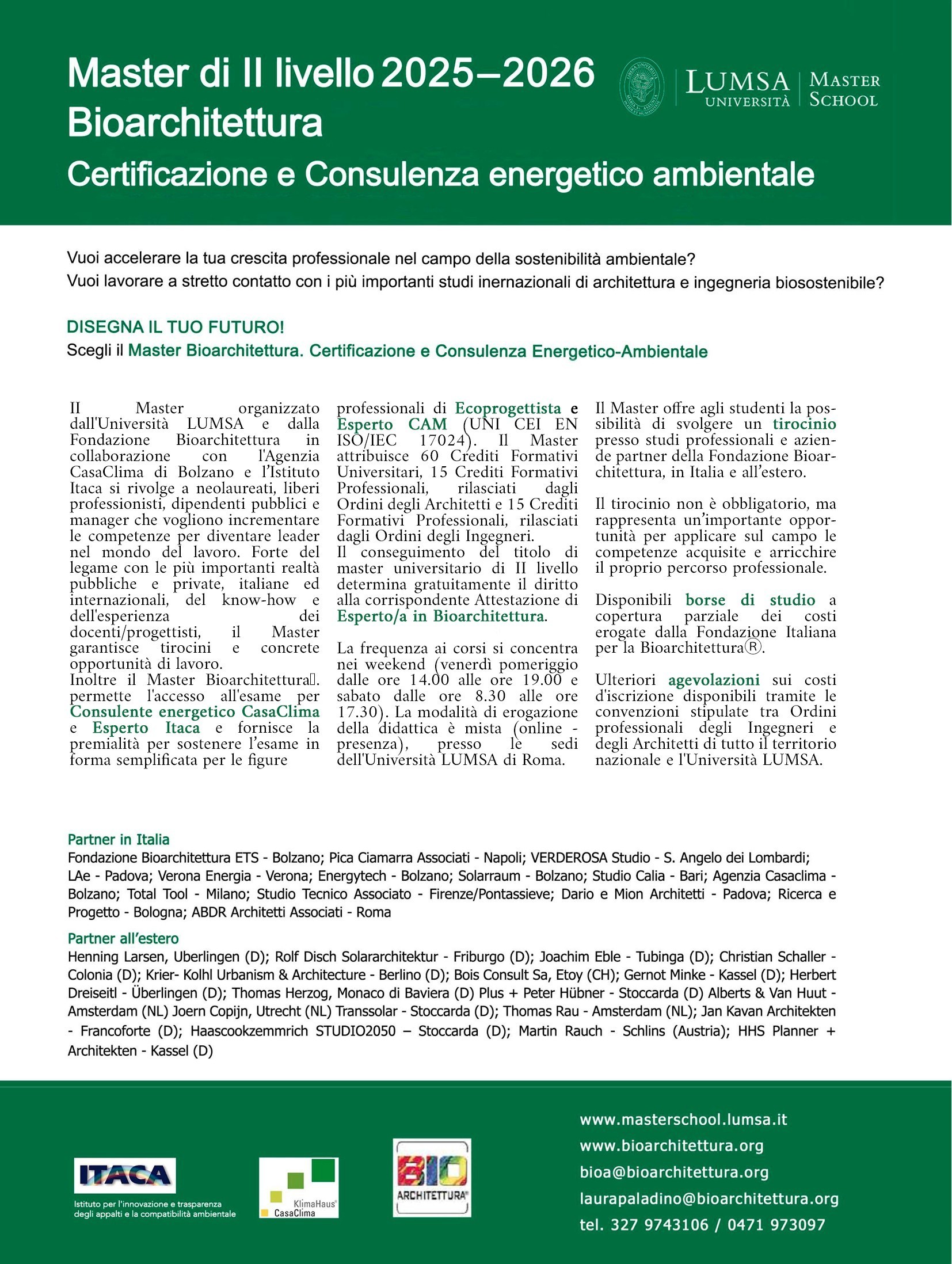 Il Master ha una forte impronta professionalizzante e consente l’accesso ai percorsi per diventare Consulente Energetico CasaClima ed Esperto ITACA, oltre alla possibilità di sostenere gli esami CAM. È inoltre prevista, per gli studenti che lo desiderano, l’opportunità di svolgere tirocini presso studi professionali e aziende partner della Fondazione Bioarchitettura, Il corso si rivolge a liberi professionisti, funzionari pubblici, tecnici e operatori del settore edilizio interessati a sviluppare competenze avanzate nella progettazione sostenibile e nella consulenza energetico-ambientale. Possono accedere candidati in possesso di una laurea magistrale o equivalente, italiana o straniera, ritenuta idonea dalla Direzione del Master. Il percorso è supportato da un Comitato Scientifico di alto profilo, composto da autorevoli esponenti del mondo accademico e professionale.