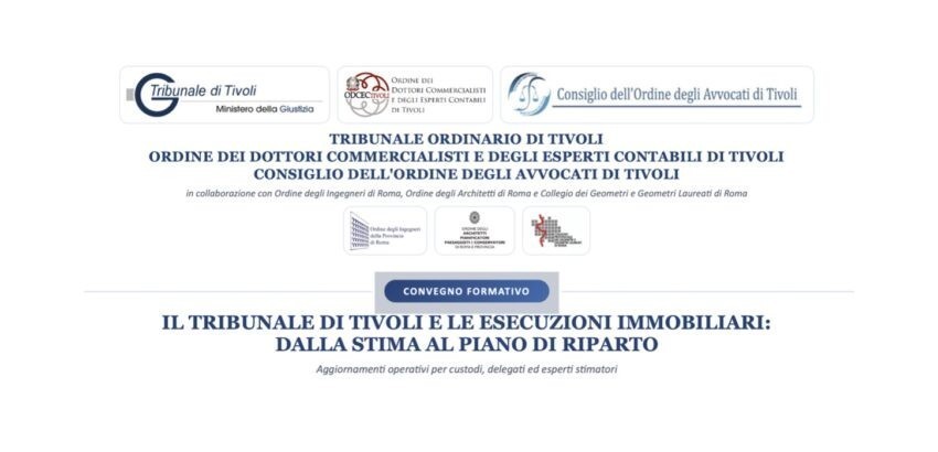 Si terrà il prossimo 7 maggio, dalle ore 14:30 alle 18:30, presso l’Hotel Cristallo Relais di Tivoli, il convegno formativo «Il Tribunale di Tivoli e le esecuzioni immobiliari: dalla stima al piano di riparto», un appuntamento dedicato agli aggiornamenti operativi per custodi, delegati ed esperti stimatori. L’iniziativa è promossa dal Tribunale Ordinario di Tivoli insieme all’Ordine dei Dottori Commercialisti e degli Esperti Contabili di Tivoli e al Consiglio dell’Ordine degli Avvocati di Tivoli, in collaborazione con l’Ordine degli Architetti PPC di Roma e Provincia, l’Ordine degli Ingegneri di Roma e il Collegio dei Geometri e Geometri Laureati di Roma. Tra i saluti istituzionali è prevista la partecipazione del consigliere OAR, Raffaele Bencardino.