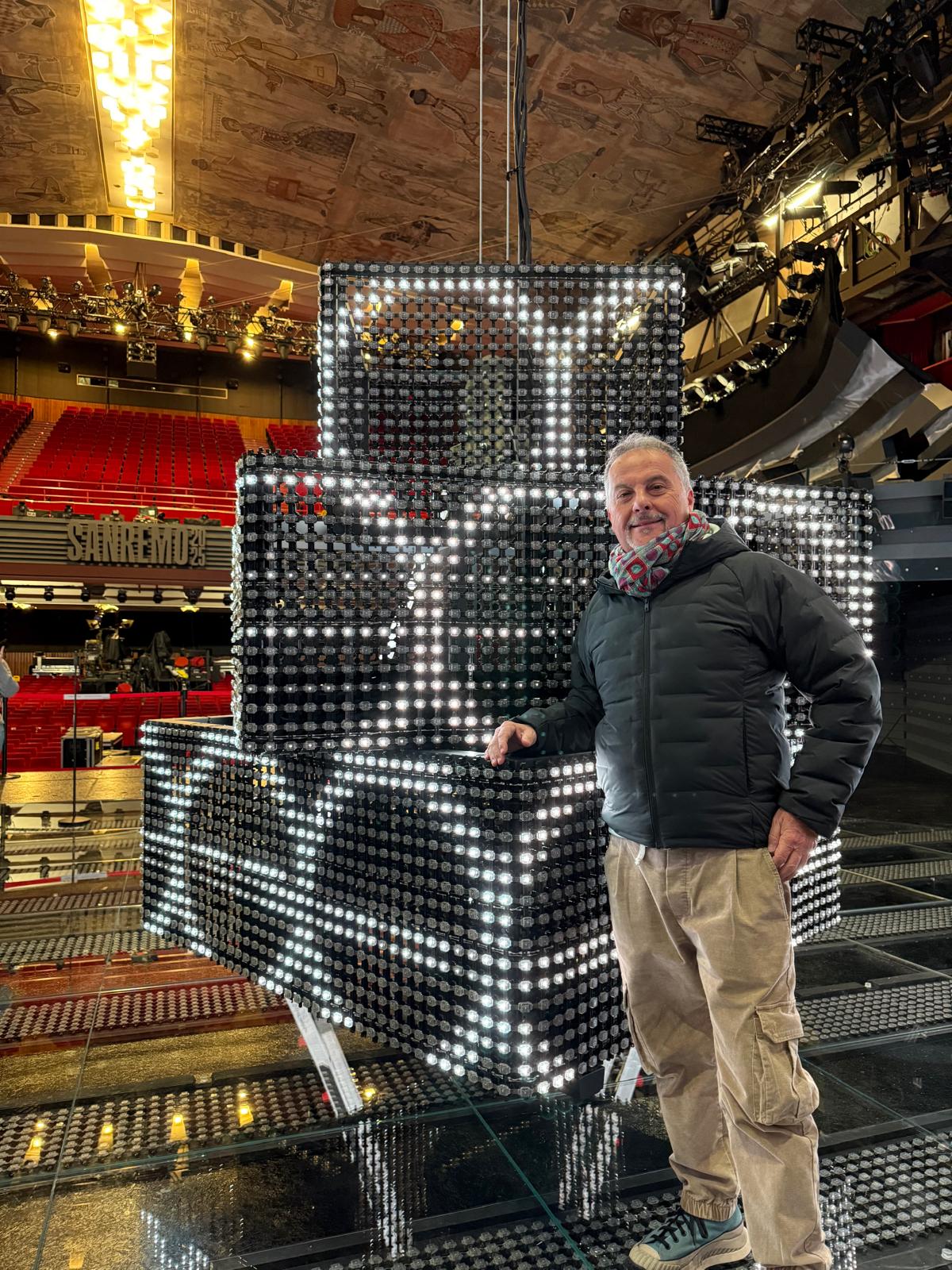 “Io progetto per la televisione, quindi le mie scene si attivano completamente solo quando si accende la telecamera: sono le inquadrature che modificano le situazioni. È chiaro però che le persone del pubblico presente in sala sono le prime a fornire un riscontro sulla qualità dell’opera. In questa edizione il pubblico potrà vedere chiaramente la scala che porta dal palco alla platea, pazzesca in vetro nero fumé, con dietro un ledwall. Da quando abbiamo il digitale si coglie ogni dettaglio anche da casa. Una volta potevi lasciare dei buchi nella scenografia, perché non visibili. Con il digitale l’immagine è molto nitida e definita. A Sanremo poi abbiamo il 4D! Come mia consuetudine, ho predisposto delle motorizzazioni che calano dall’alto e cambiano la scena. Ho inserito sipari tecnologici e tecno lampadari, che contengono sia apparati video sia apparati di luce di fotografia e che scendono dall’alto in dieci posizioni diverse. Punto alla qualità totale: mi piace che ogni dettaglio sia curato. Se c’è una scaletta di servizio, che nessuno vede, voglio comunque che risulti ben rifinita”.