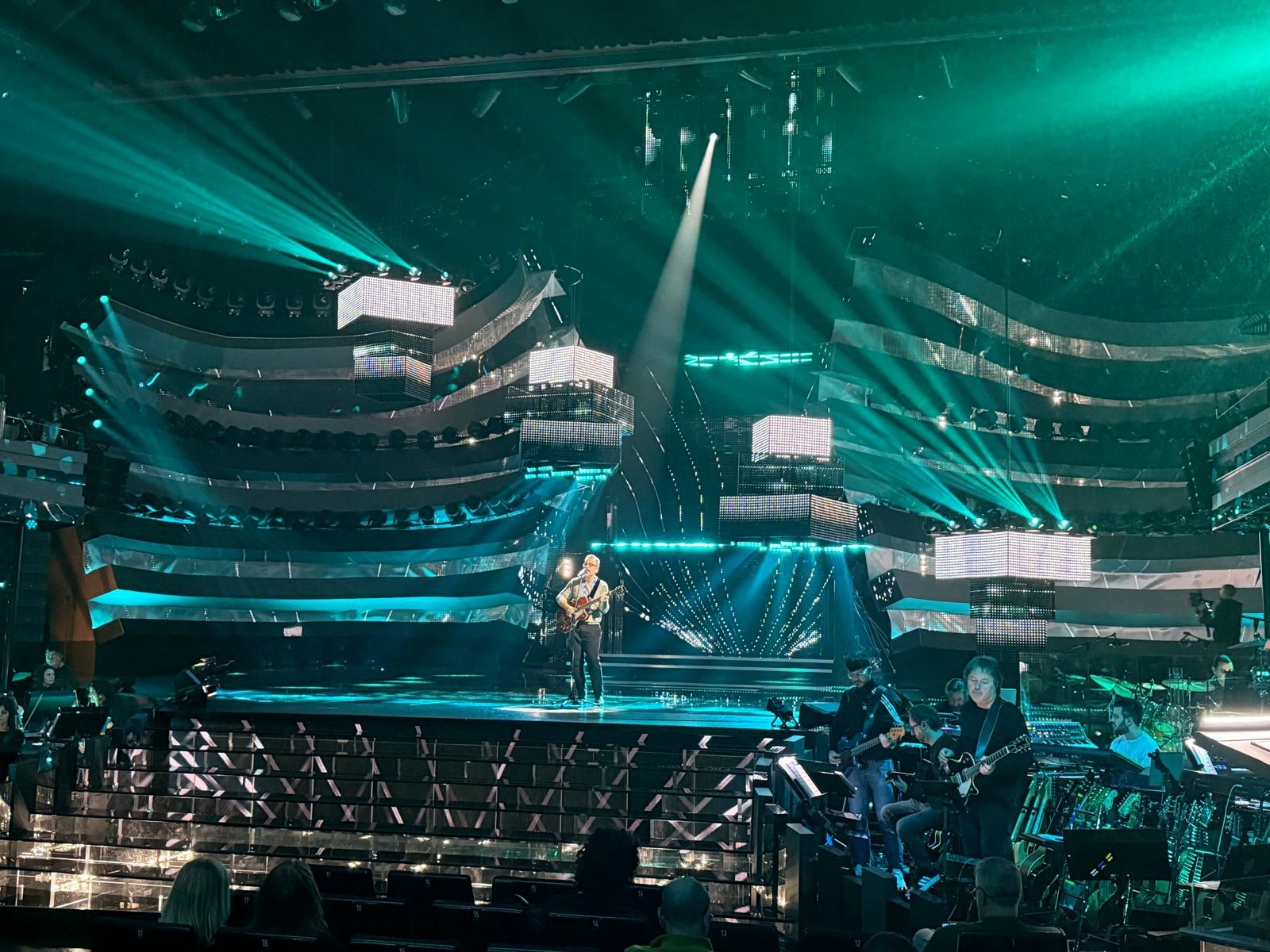 “La scenografia è un progetto vero e proprio. La concezione architettonica è un fattore determinante per riuscire a gestire 54 orchestrali (a destra la ritmica a sinistra la sinfonica, con fiati e cori posizionati su due piani rialzati di 2,50 metri) e una platea di 700 persone che abbiamo deciso di tagliare al centro per consentire le inquadrature centrali. Come un direttore d’orchestra, lo scenografo deve organizzare spazialmente i movimenti delle telecamere per le inquadrature, degli operatori di ripresa e dei musicisti/artisti, oltre a coordinarsi con il direttore della fotografia per le esigenze illuminotecniche o con i responsabili dell’audio per la disposizione delle apparecchiature. In altri termini, chi progetta la scena è al centro di tante micro-progettazioni. Avendo lavorato come ispettore di studio e conoscendo le necessità delle maestranze, preferisco avere un palco ed un retropalco ampi, perché anche nel dietro le quinte succedono molte cose”.