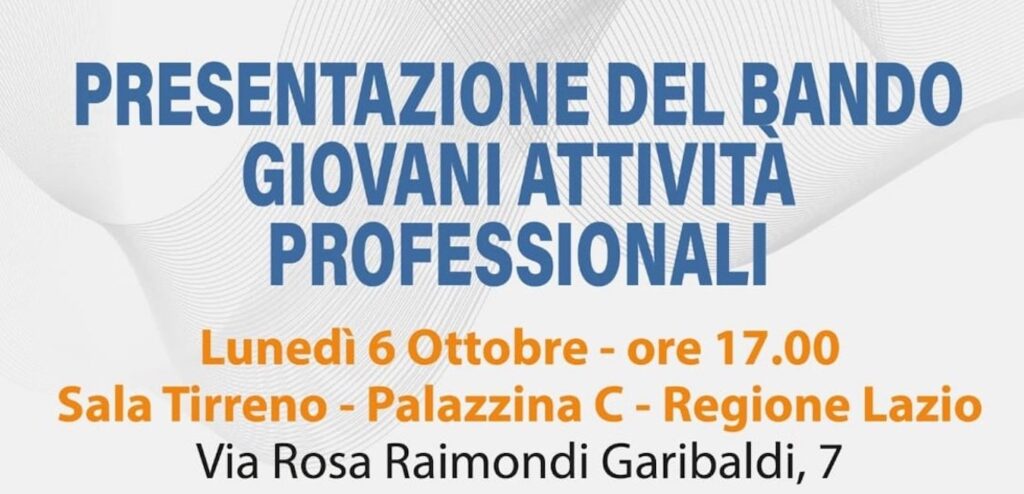 Lunedì 6 ottobre 2025, alle ore 17, presso la Sala Tirreno della Regione Lazio, si terrà l’incontro di presentazione del bando regionale “Giovani Attività Professionali”, dedicato al sostegno dell’avviamento e dello sviluppo delle attività dei professionisti under 40. L’iniziativa – promossa dal Vicepresidente della Regione Lazio Roberta Angelilli insieme alla Consulta dei Giovani Imprenditori e […]