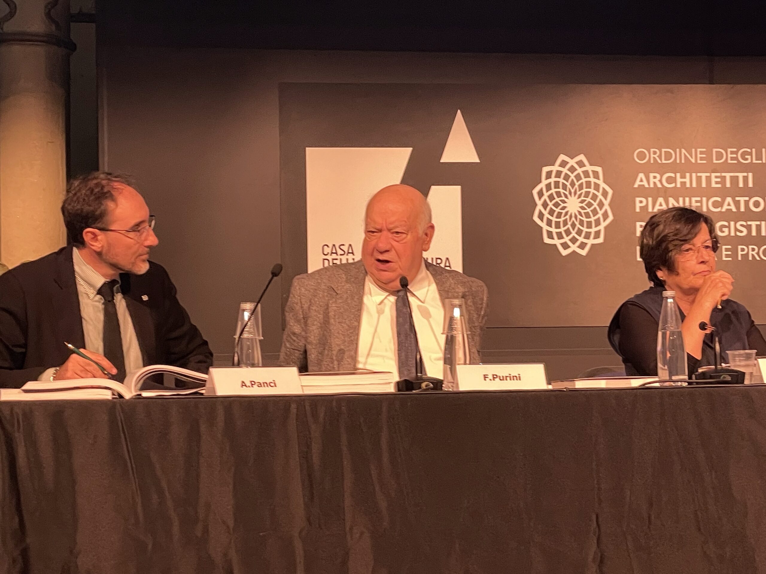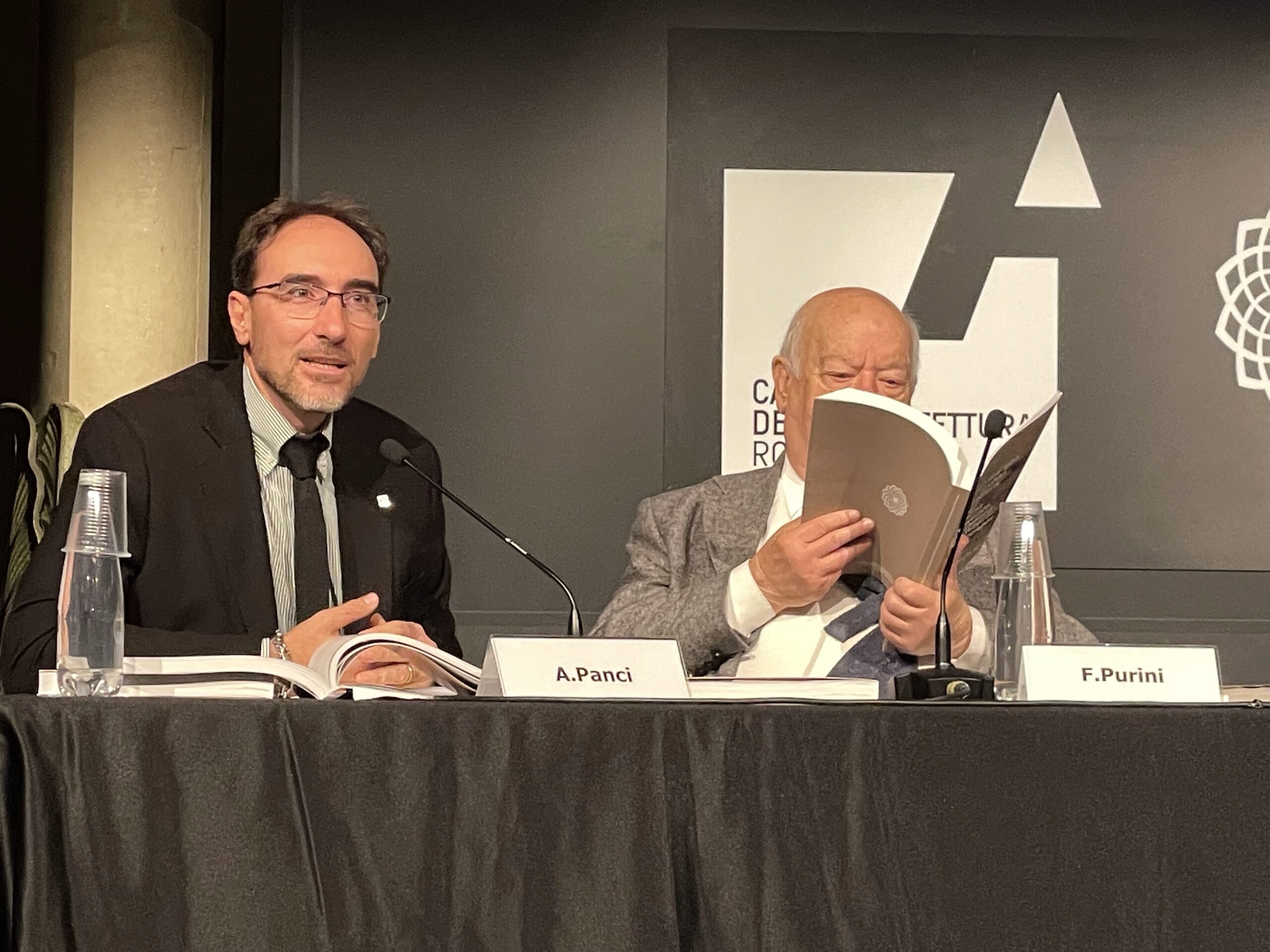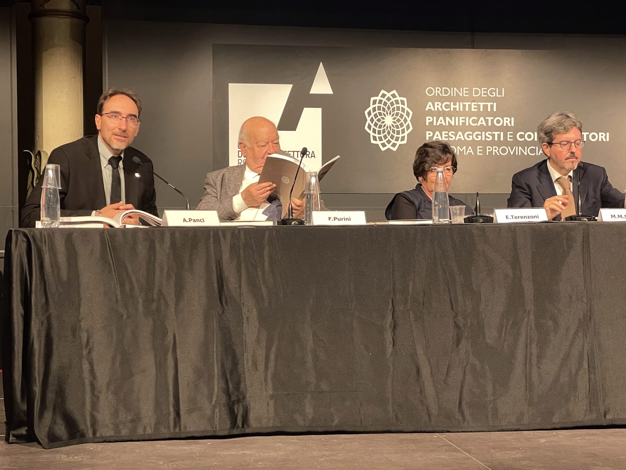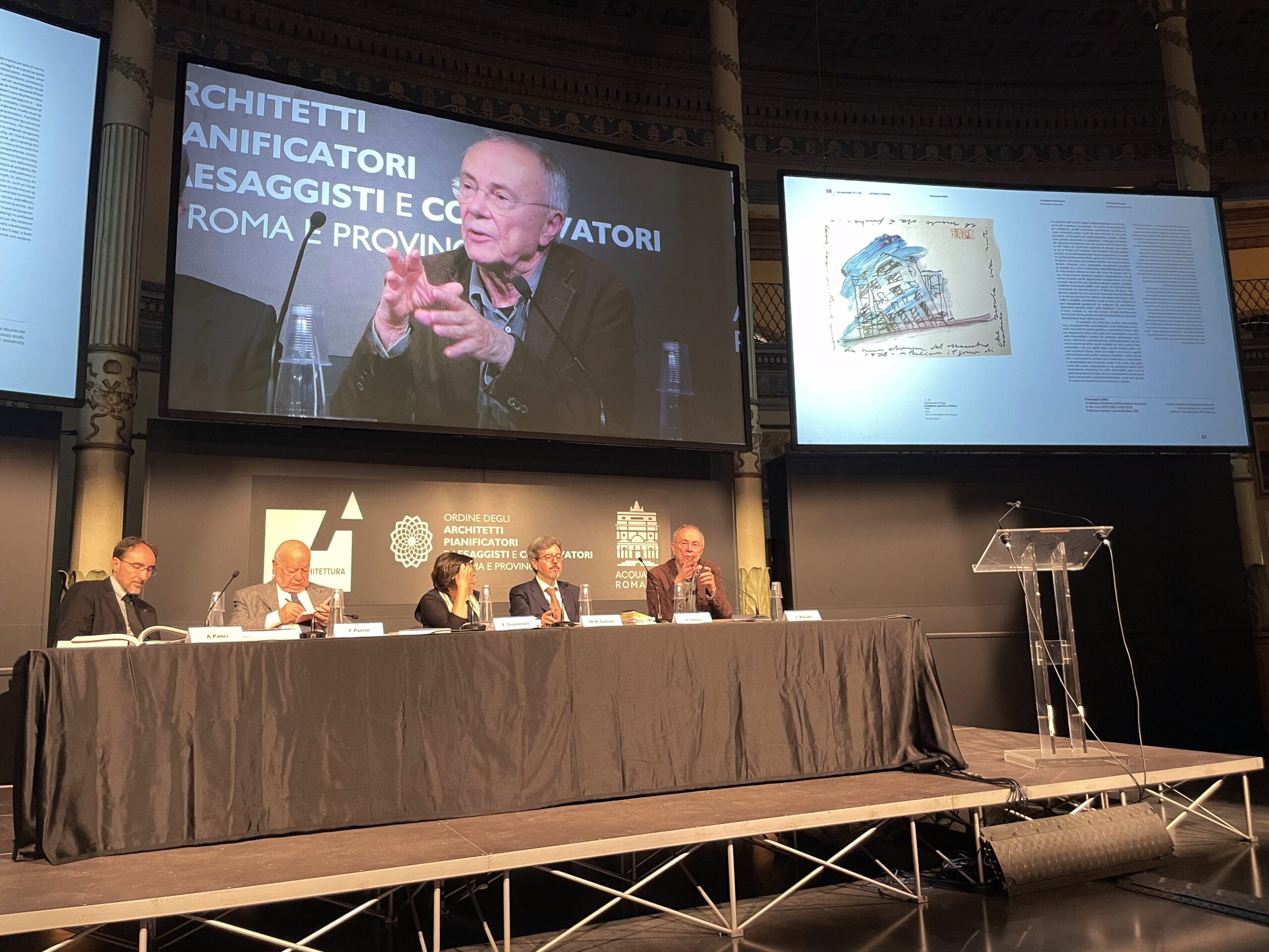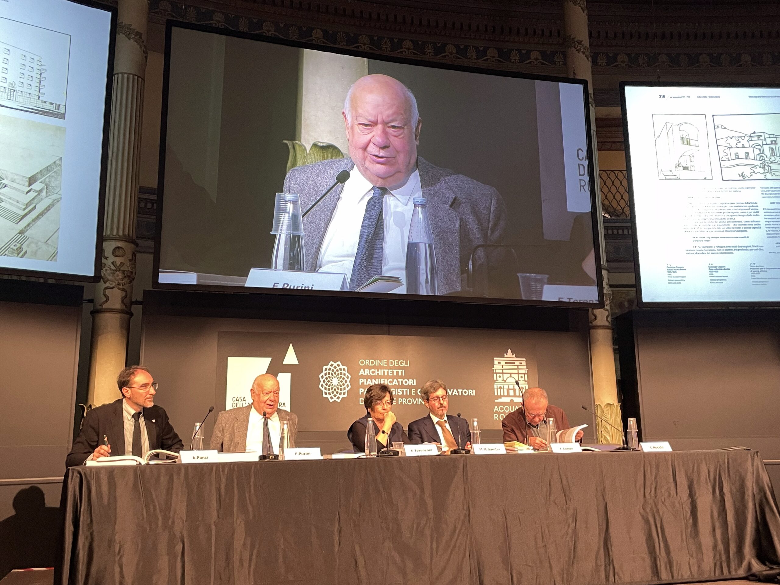 Si è soffermato, tra l’altro, sul «rapporto tra architettura e tempo» il ragionamento di Franco Purini, architetto e professore emerito della Sapienza. «Noi architetti viviamo nel tempo che viene stabilito, ma a volte non ci accorgiamo che questo tempo è molto più complesso. L’architettura si verifica anche con un tempo diverso da quello che imaginiamo. Il compito dell’architetto – nel fare architettura, nel costruirla, nel pensarla – è capire fino in fondo cosa sia il tempo, perché solo così possiamo accordarci con le difficoltà e i mutamenti che esso comporta». Guardando al passato, dunque, anche per vedere il futuro.