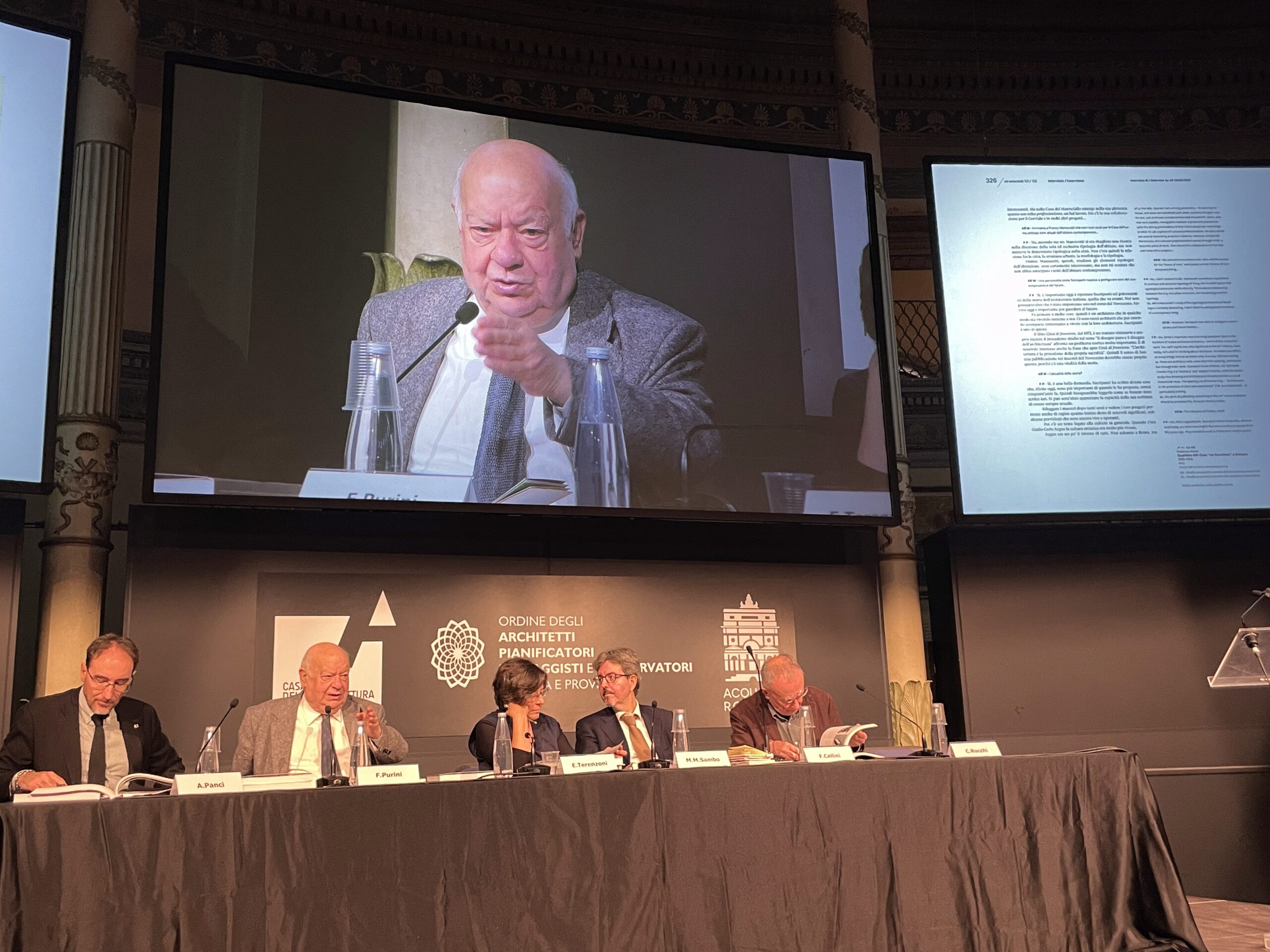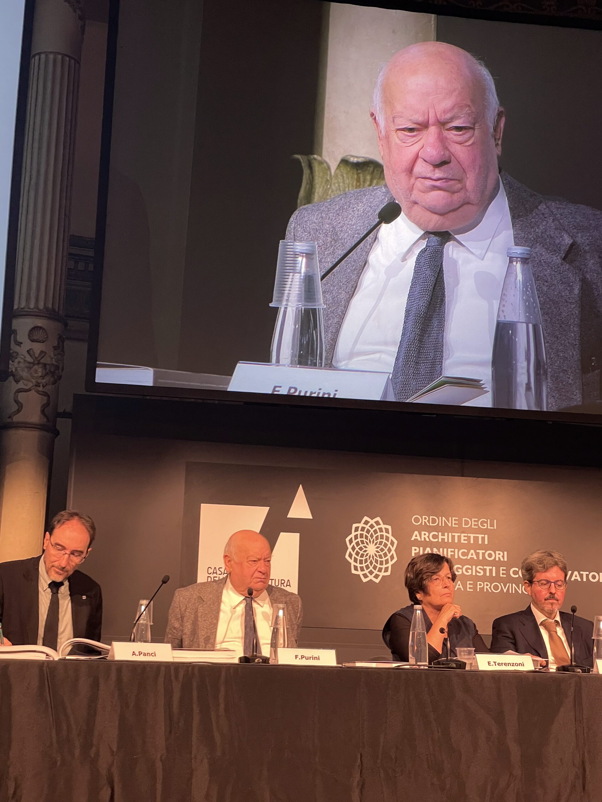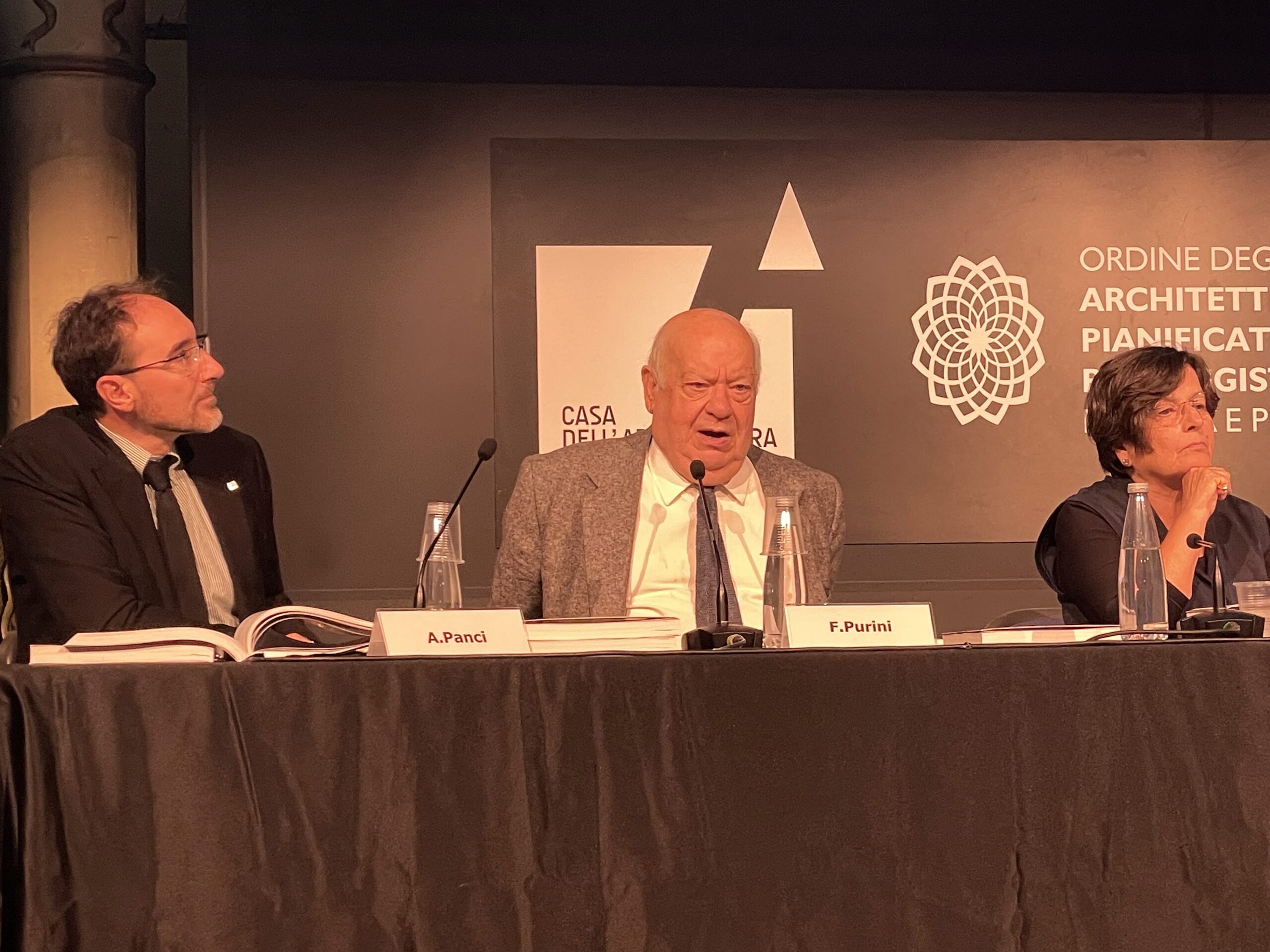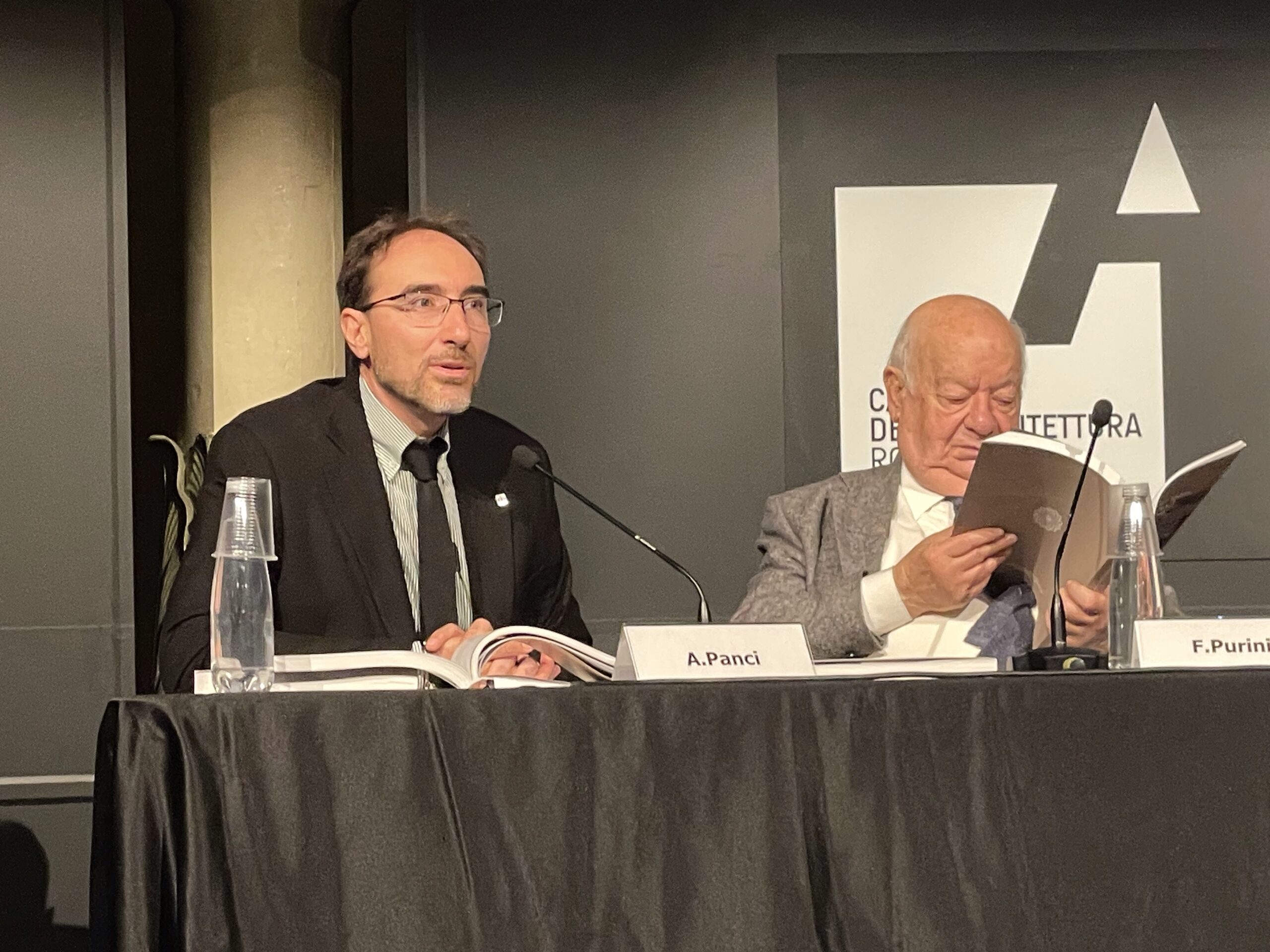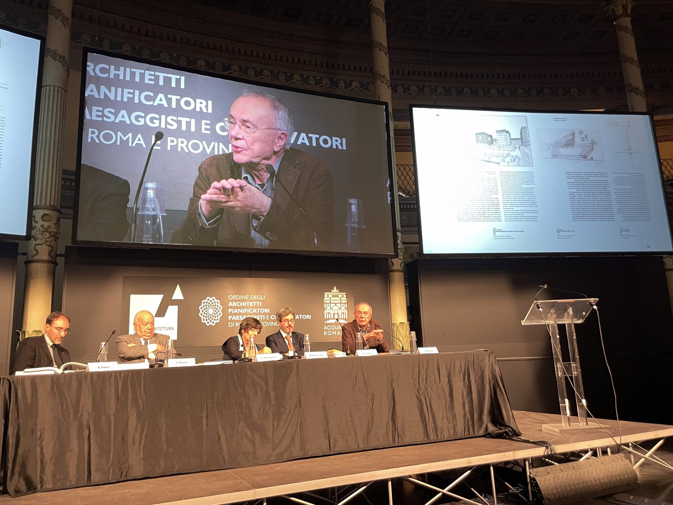 Si è soffermato, tra l’altro, sul «rapporto tra architettura e tempo» il ragionamento di Franco Purini, architetto e professore emerito della Sapienza. «Noi architetti viviamo nel tempo che viene stabilito, ma a volte non ci accorgiamo che questo tempo è molto più complesso. L’architettura si verifica anche con un tempo diverso da quello che imaginiamo. Il compito dell’architetto – nel fare architettura, nel costruirla, nel pensarla – è capire fino in fondo cosa sia il tempo, perché solo così possiamo accordarci con le difficoltà e i mutamenti che esso comporta». Guardando al passato, dunque, anche per vedere il futuro.
