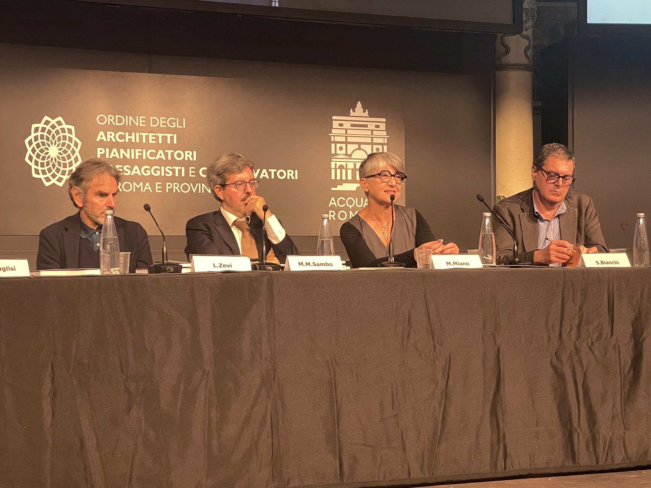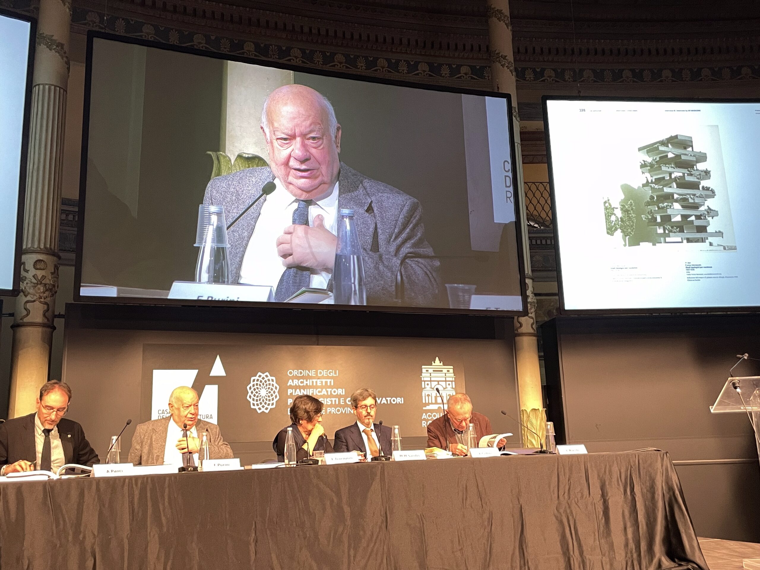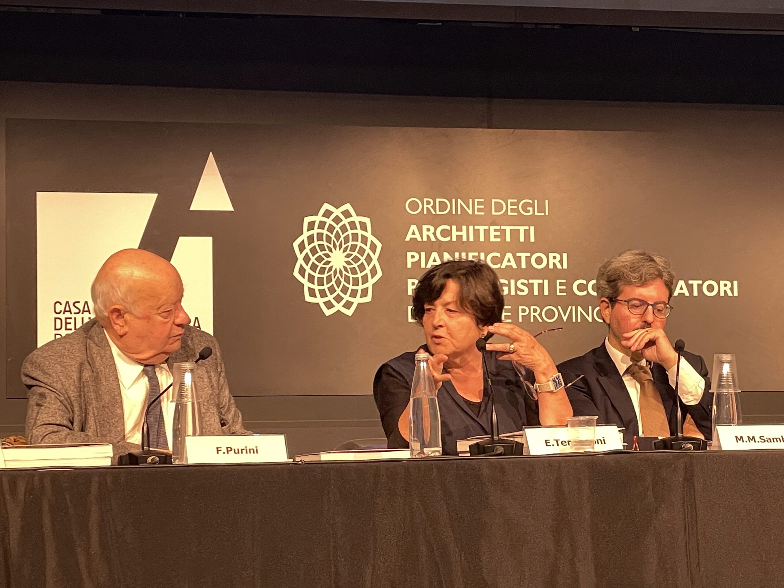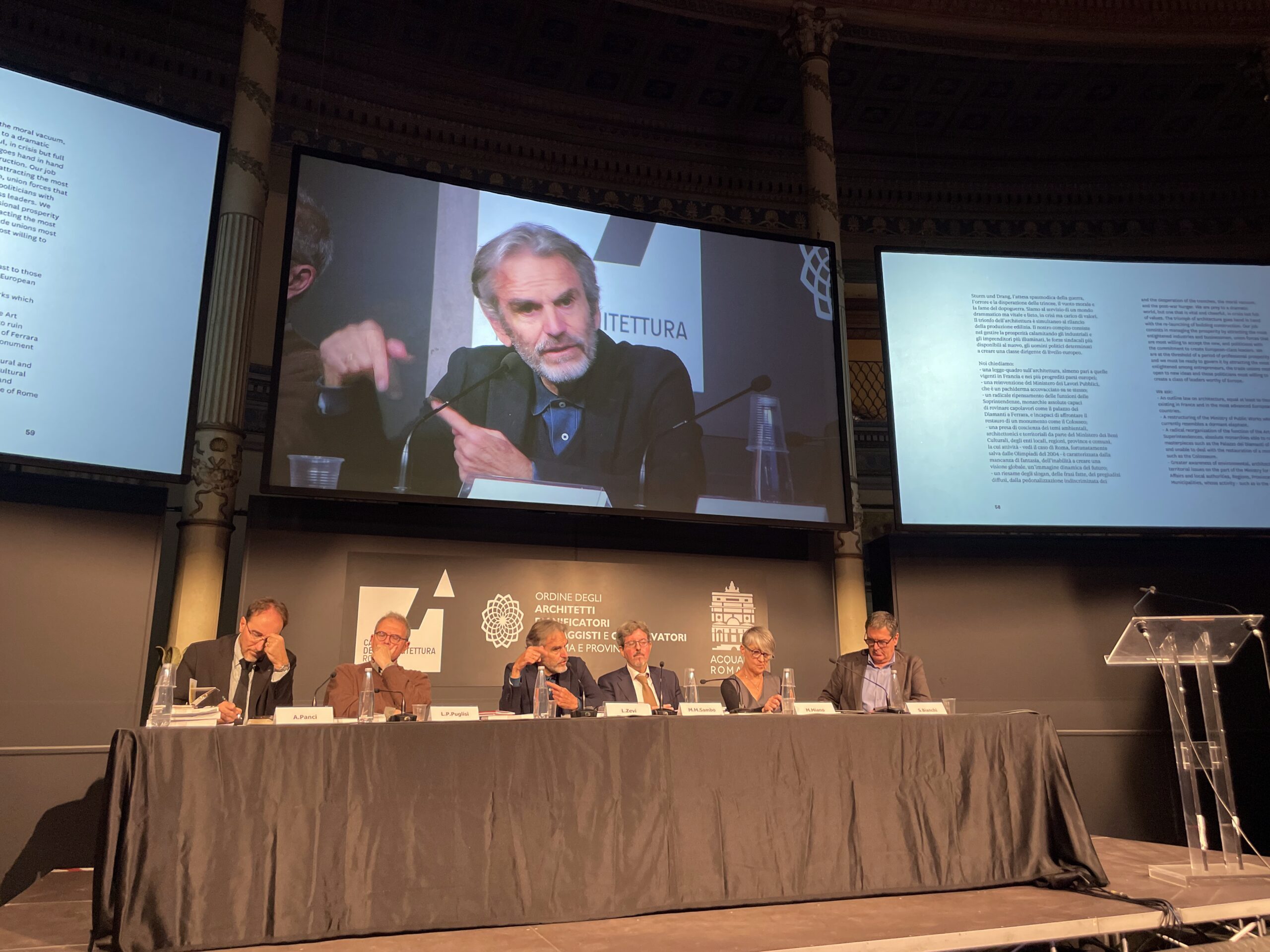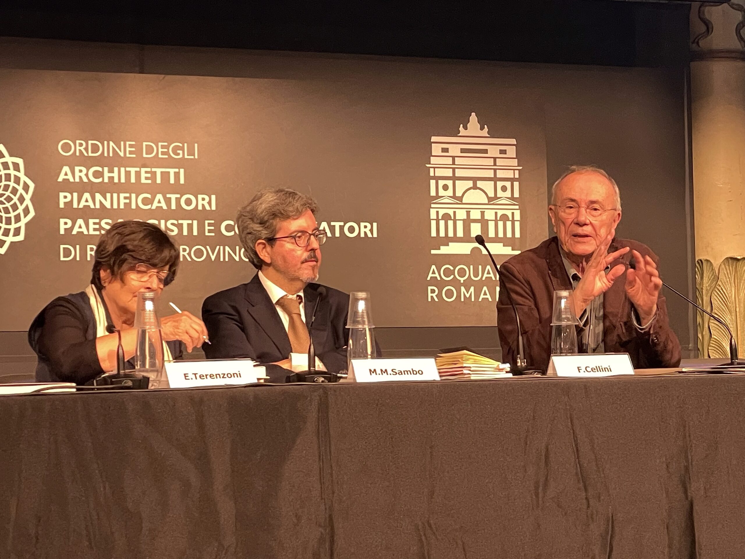 Si è soffermato, tra l’altro, sul «rapporto tra architettura e tempo» il ragionamento di Franco Purini, architetto e professore emerito della Sapienza. «Noi architetti viviamo nel tempo che viene stabilito, ma a volte non ci accorgiamo che questo tempo è molto più complesso. L’architettura si verifica anche con un tempo diverso da quello che imaginiamo. Il compito dell’architetto – nel fare architettura, nel costruirla, nel pensarla – è capire fino in fondo cosa sia il tempo, perché solo così possiamo accordarci con le difficoltà e i mutamenti che esso comporta». Guardando al passato, dunque, anche per vedere il futuro.