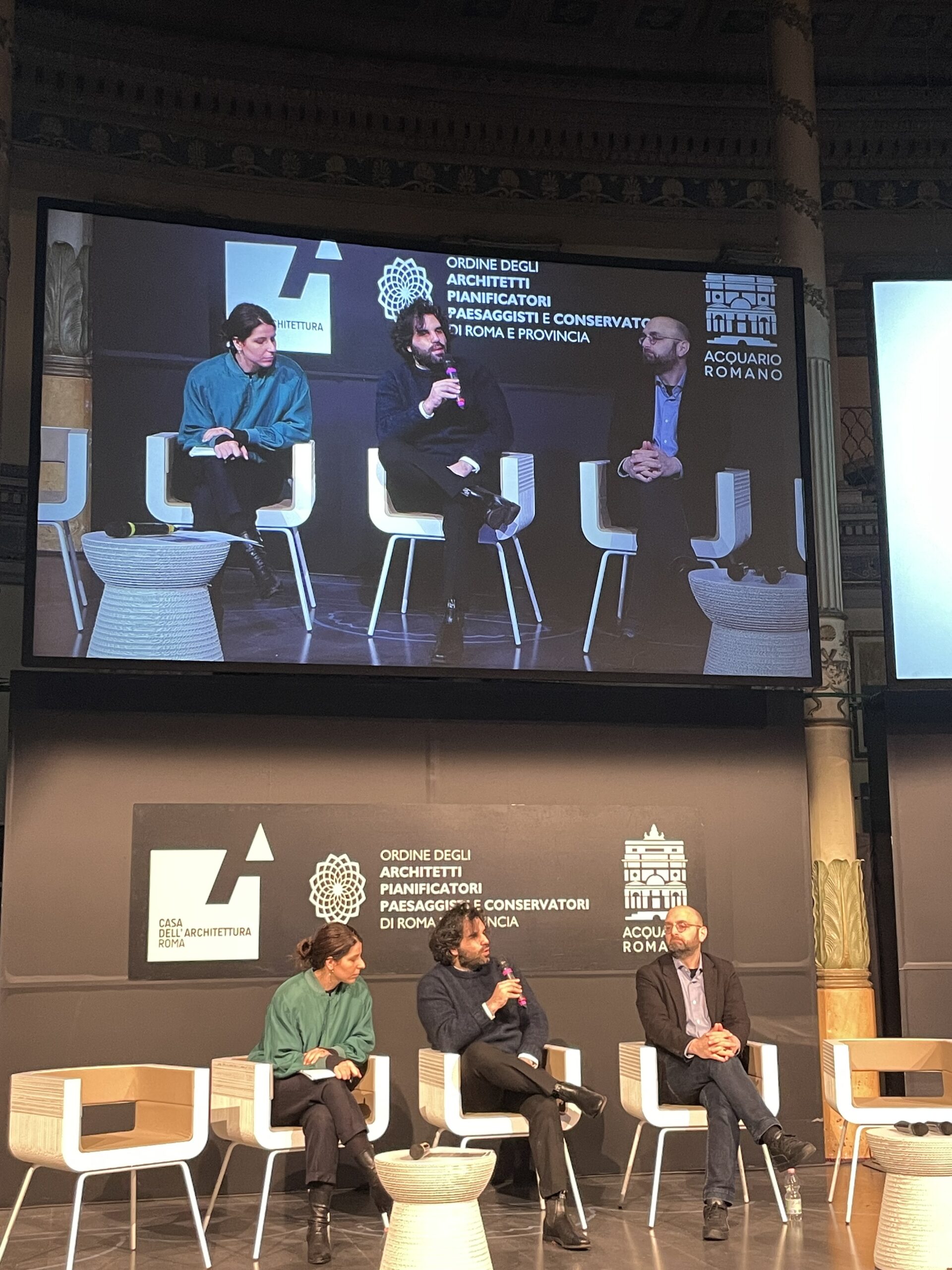 Lo spazio dedicato dialogo critico con giovani ricercatori provenienti dalle principali università europee è stato invece inaugurato – in occasione dell’incontro con MVRDV – da Sabrina Morreale e Lorenzo Perri fondatori dello studio Lemonot, realtà nata nel 2016 con sedi a Londra e a Prato che unisce architettura e arti performative e che ha già collaborato con l’Ordine degli Architetti di Roma realizzando nei pressi del Gazometro a Ostiense l’installazione site-specific «Oasi dei Golosi» nell’ambito dell’edizione 2022 del Festival dell’Architettura di Roma (FAR) organizzato dall’OAR. I due ricercatori di Lemonot, che insegnano presso il Royal College of Art di Londra, hanno posto a Lorenzo Mattozzi domande e spunti di riflessione connessi a una serie di tematiche – subject, approach, outcome, functions, activities, choreographies, publicness, conviviality, accessibility – connesse all’approccio progettuale di MVRDV, così come è emerso anche dalla lecture.