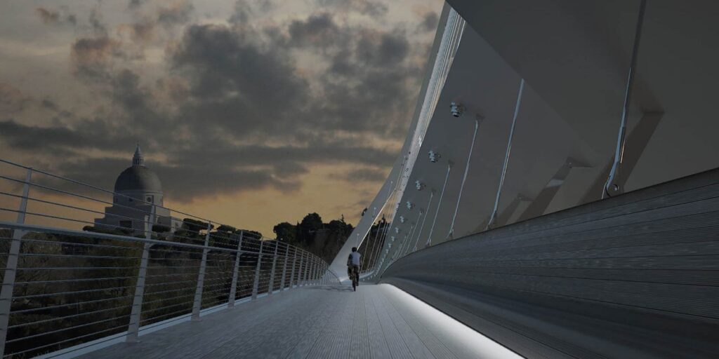 Tale design non solo garantisce un impatto visivo iconico perfettamente integrato nel contesto, ma assicura una funzionalità ottimale distribuendo i flussi su più livelli: quello veicolare sulla sede principale concepita a senso unico e quelli ciclabili e pedonali al piano sottostante.