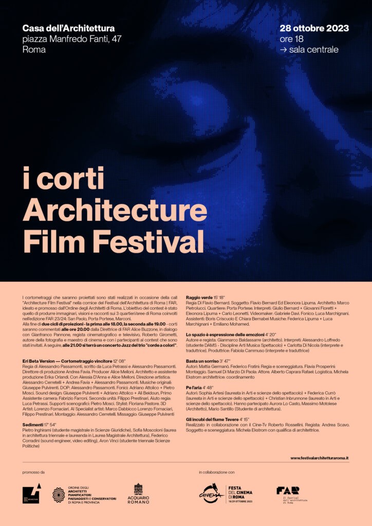 I cortometraggi che saranno proiettati sono stati realizzati in occasione della call “Architecture Film Festival” nella cornice del Festival dell’Architettura di Roma | FAR, ideato e promosso dall’Ordine degli Architetti di Roma. L’obiettivo del contest è stato quello di produrre immaginari, visioni e racconti sui 3 quartieri/aree di Roma coinvolti nell’edizione FAR 23/24: San Paolo, Porta Portese, Marconi.