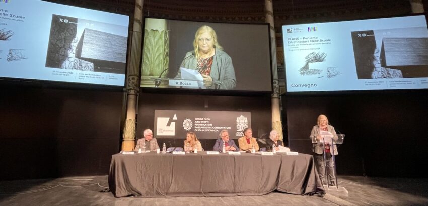 Lo scorso 27 novembre, alla Casa dell’Architettura, si è svolto l’evento di apertura dell’anno scolastico 2023/2024 di Plans, che si propone di attivare, nelle scuole che aderiranno al programma, un laboratorio con gli studenti imperniato, come detto, sul tema della memoria: in occasione del convegno, con il coordinamento scientifico di Roberta Bocca, vicepresidente OAR e coordinatrice della Commissione – di cui fanno parte Valentina Di Stefano, Antonia Genco, Pierpaolo Giannuzzi, Marcello Mele, Ilaria Olivieri, Giuseppe Parisio – sono stati proposti approfondimenti sull’argomento, spaziando dal linguaggio digitale alla memoria collettiva «che diventa architettura» – come nel caso dei memoriali – fino alla fotografia. Nel corso della giornata si è svolta una performance live di street art ispirata al genius loci.