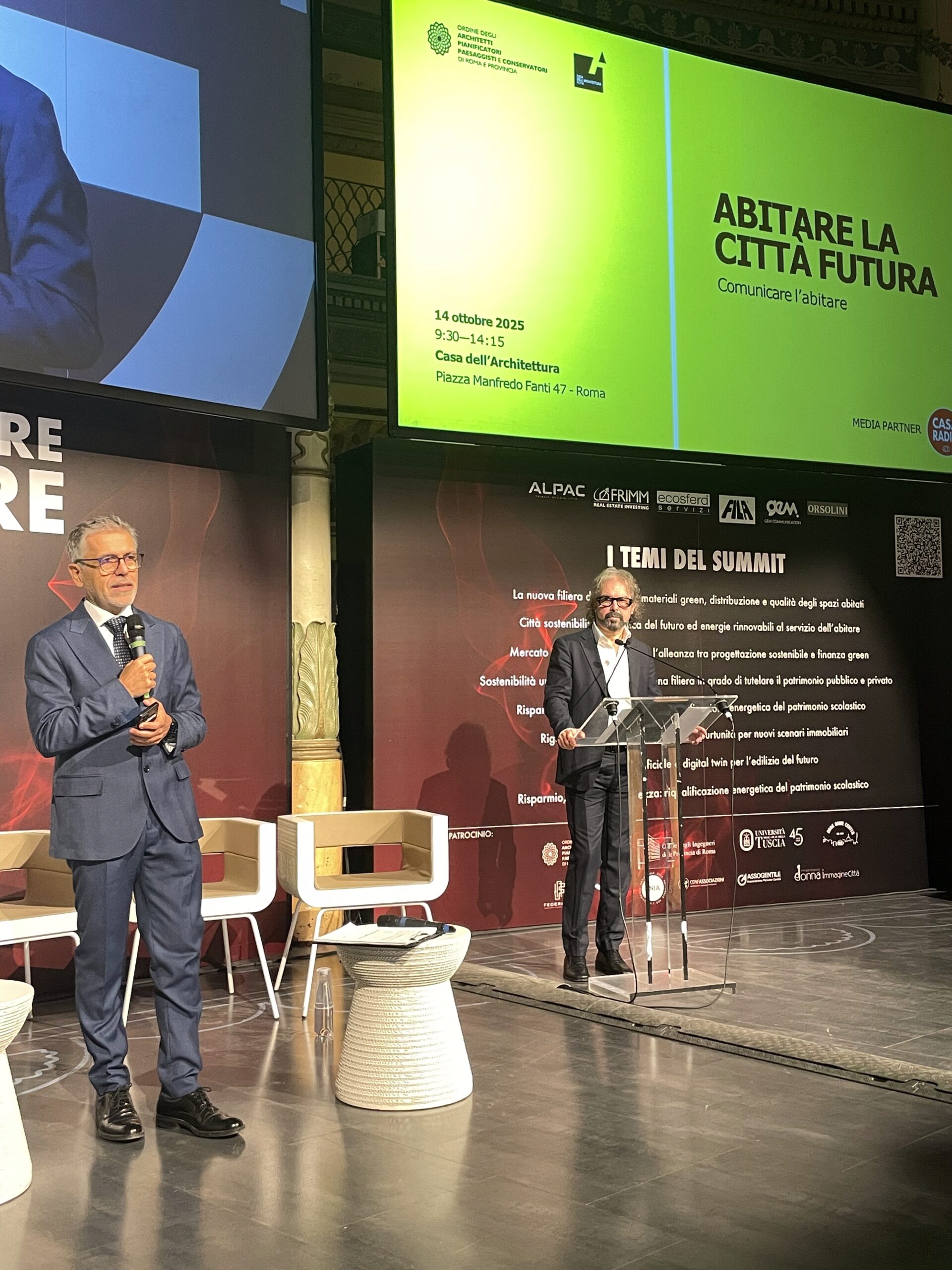 Ad aprire i lavori è stato il consigliere OAR Simone Cellitti, coordinamento scientifico dell’evento, introducendo i temi della giornata e sottolineando il valore del dialogo tra le diverse anime del settore. «Affrontiamo il tema Abitare la città futura – ha detto -, raccogliendo aspetti tecnici e multidisciplinari con stakeholder di settore, imprese, ingegneri e architetti. Parliamo di sostenibilità energetica e di rigenerazione urbana, in linea con alcuni degli obiettivi del mandato appena iniziaito da nuovo Consiglio dell’OAR: creare sinergie con altre discipline e realtà, comunicando in modo trasversale, raggiungendo pubblici diversi e ampliando l’impatto culturale del nostro lavoro». In quest’ottica si inserisce anche la media partnership con Casa Radio, come sottolinea il direttore editoriale dell’emittente, Paolo Leccese, evidenziando la dimensione formativa e divulgativa dell’iniziativa: «Si tratta di una giornata di alta formazione organizzata con l’Ordine di Roma dedicata alla rigenerazione urbana e alle città del futuro. È anche un’occasione per riflettere su come le nuove tecnologie potranno migliorare la qualità del vivere, con un approccio concreto e multidisciplinare che coinvolge professionisti, imprese e cittadini».