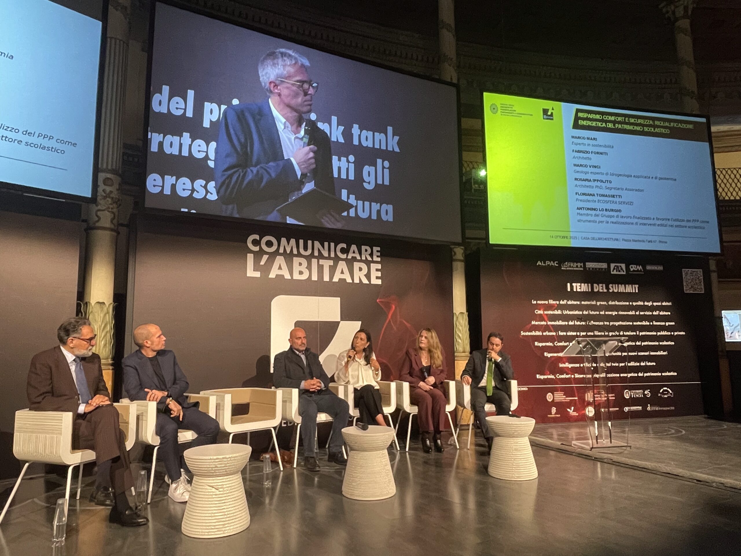 Le strategie di efficientamento e l’adeguamento del patrimonio scolastico italiano – una tipologia di immobili che necessita di una profonda rigenerazione per garantire comfort, sostenibilità e resilienza – sono state alcune delle tematiche al centro del tavolo che si è concentrato su «risparmio, comfort e sicurezza». Sono intervenuti l’architetto Fabrizio Forniti; l’architetto PhD e segretario Assoradon, Rosaria Ippolito; Antonino Lo Burgio, componente del gruppo di lavoro finalizzato a favorire l’utilizzo del partenariato pubblico privato come strumento per la realizzazione di interventi edilizi nel settore scolastico; Marco Mari, esperto in sostenibilità; Floriana Tomassetti, presidente Esosfera Servizi; e Marco Vinci, geologo esperto di Idrogeologia applicata e di geotermia. A confronto esperienze e progetti concreti su riqualificazione energetica e partenariato pubblico-privato nel settore scolastico.